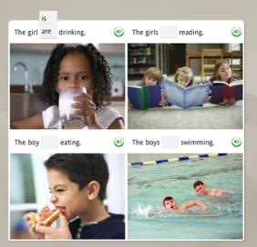 単語が抜けたフレーズが表示され、その抜けた部分の空欄に、複数の選択肢が表示されます。適切な単語をクリックして、正しいフレーズを完成させます。